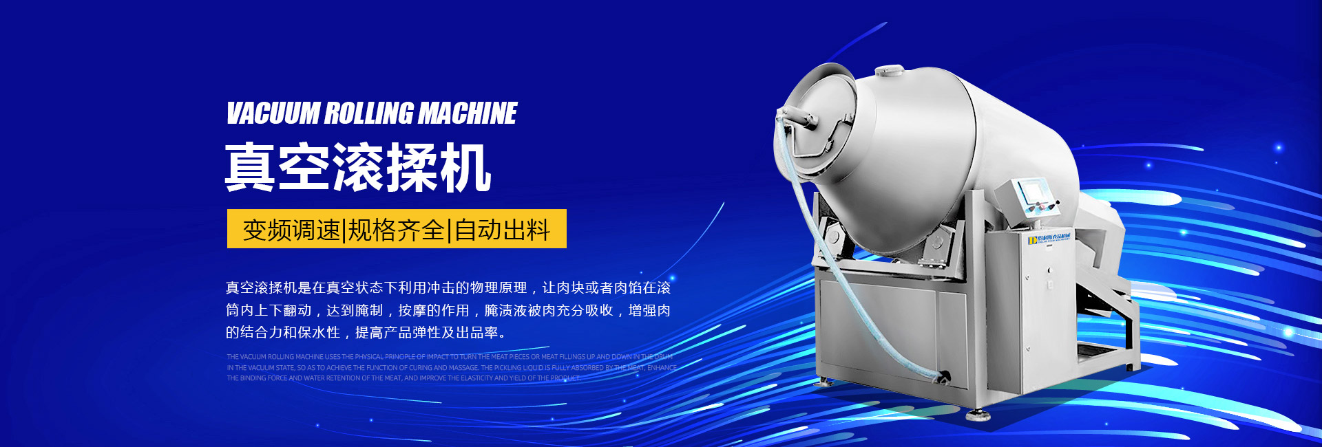 公司主要生產不銹鋼制品食品機械:各種規格型號真空滾揉機、制冷滾揉機、提升機、電加熱夾層鍋、肉丸機、真空攪拌機、絞肉機、灌腸機、打卡機、線扎機、斬拌機、鹽水注射機、煙熏爐、油炸機、巴氏殺菌線、連續油炸線、肉丸成型水煮線、醬鹵生產線、肉丸破碎機、真空包裝機、洗袋風干機、豬頭劈半機、不銹鋼火腿模具、肉斗車、案桌、煙熏車、屠宰類機械設備、清洗風干設備、肉類解凍設備、滾筒拌料機等。產品廣泛適用于火腿腸、肉丸、肉串、鹵制品、海產品、禽類深加工、油炸、泡椒風味、速凍水餃、魚豆腐、千葉豆腐、豆腐干、牛肉干、牛排雞排類、禽蛋、麻辣、休閑、水果蔬菜清洗、中央廚房、餐飲連鎖、寵物食品等食品生產。